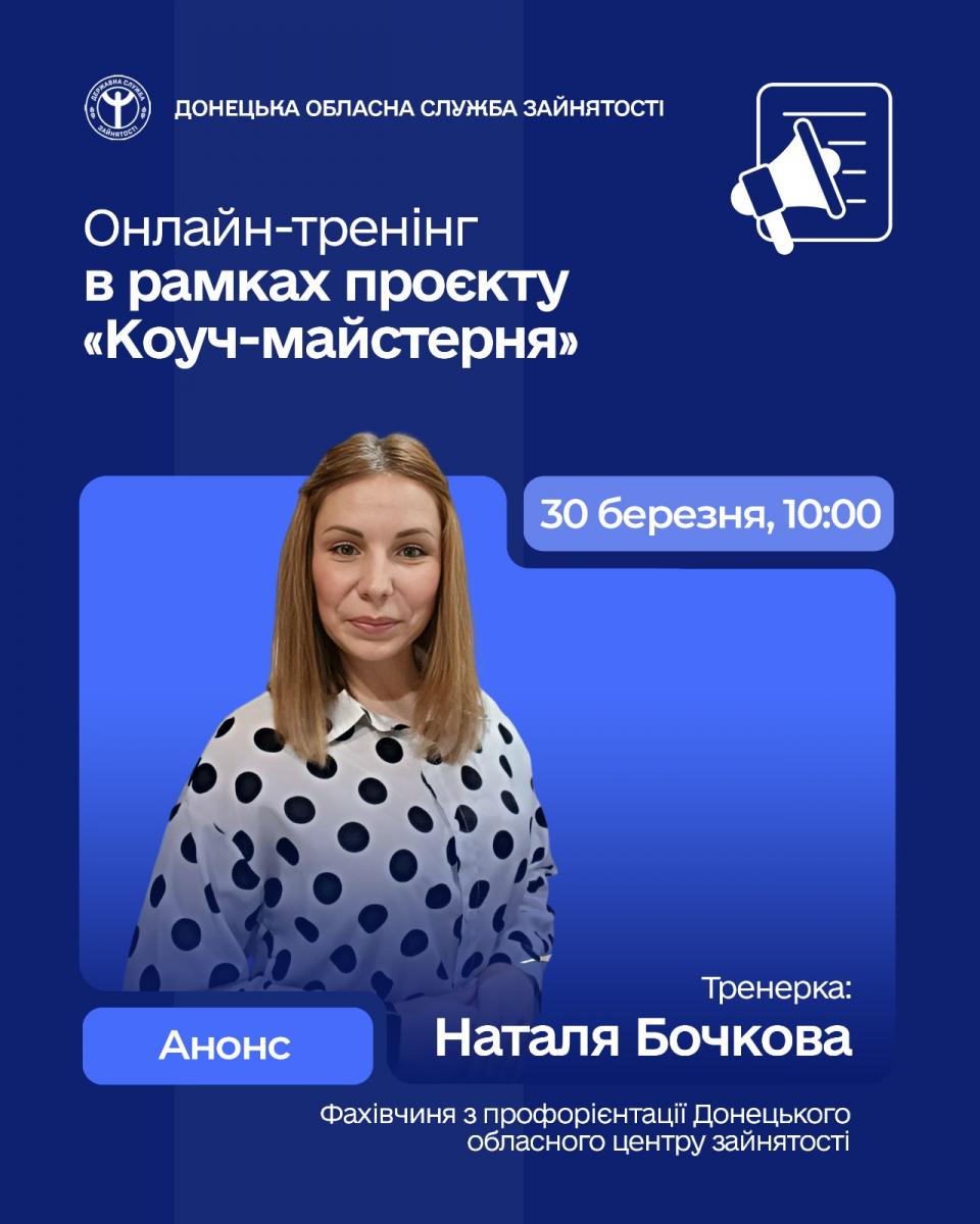 Донецька обласна служба зайнятості запрошує шукачів роботи на онлайн-тренінг у межах проєкту «Коуч-майстерня». Захід спрямований на формування конкурентних переваг на ринку праці та усвідомлене управління власною професійною траєкторією.