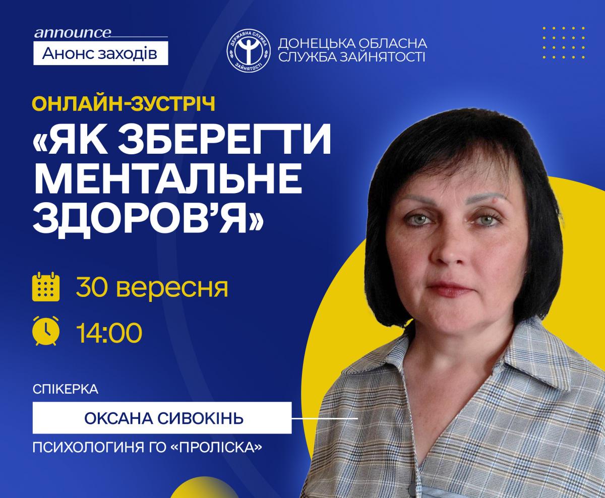 Донецький обласний центр зайнятості у співпраці з ГО «Проліска» запрошує на онлайн-зустріч, присвячену турботі про психоемоційне благополуччя.