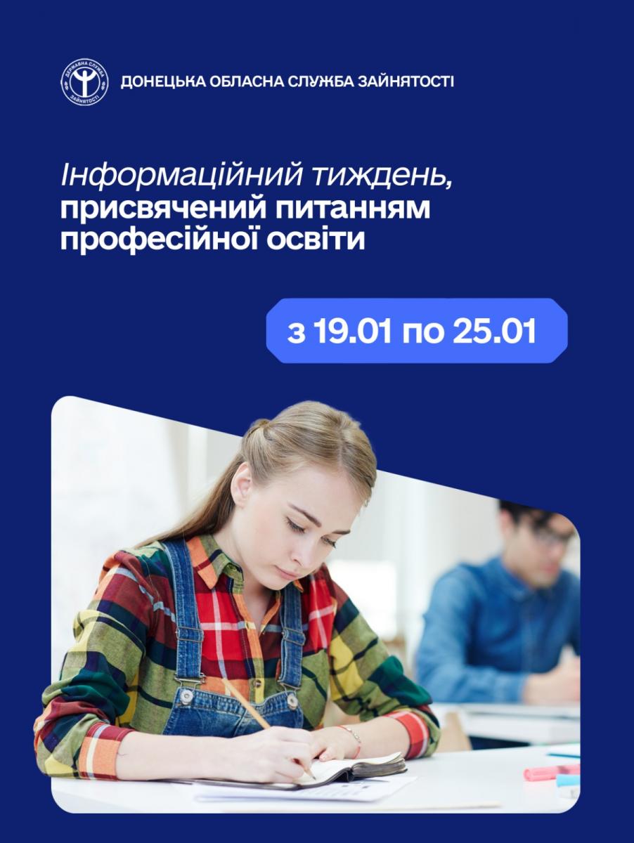 З 19 по 25 січня 2026 року Донецька обласна служба зайнятості проводить Інформаційний тиждень, присвячений питанням професійної освіти та розвитку людського потенціалу. Захід приурочено до Міжнародного дня освіти, який щорічно відзначається 24 січня, та покликаний привернути увагу до ролі освіти як ключового чинника сталого розвитку, добробуту та відновлення країни.