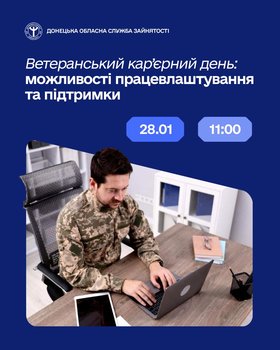 Донецький обласний центр зайнятості запрошує ветеранів і ветеранок, учасників бойових дій та членів їхніх родин на інформаційний онлайн-захід, присвячений новим кар’єрним можливостям, професійному розвитку та державній підтримці.