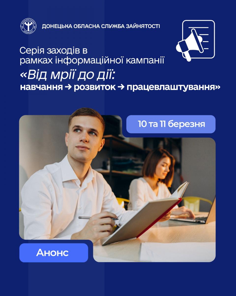 Донецький обласний центр зайнятості продовжує інформаційну кампанію «Від мрії до дії: навчання → розвиток → працевлаштування» для вимушено переміщених громадян у межах ініціативи «Ваш шлях до зайнятості». Запрошуємо долучитися до нової серії заходів, що допоможуть мотивуватися до навчання та впевнено рухатися до працевлаштування.