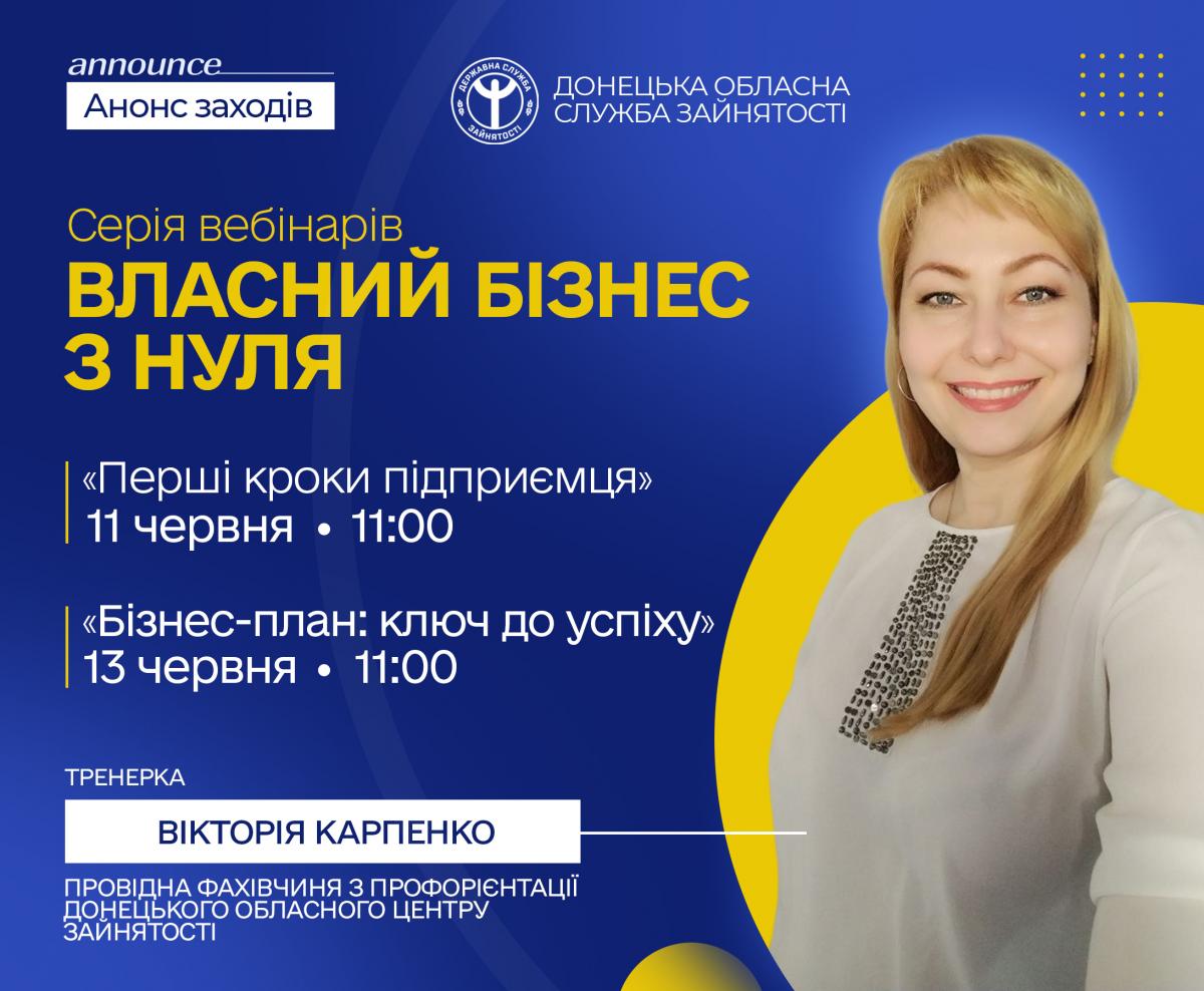 Донецький обласний центр зайнятості запрошує на серію онлайн-зустрічей, де ви дізнаєтеся, як зробити перші кроки до власного бізнесу, отримаєте практичні поради щодо розробки бізнес-плану та інформацію про фінансові можливості для розвитку підприємництва.