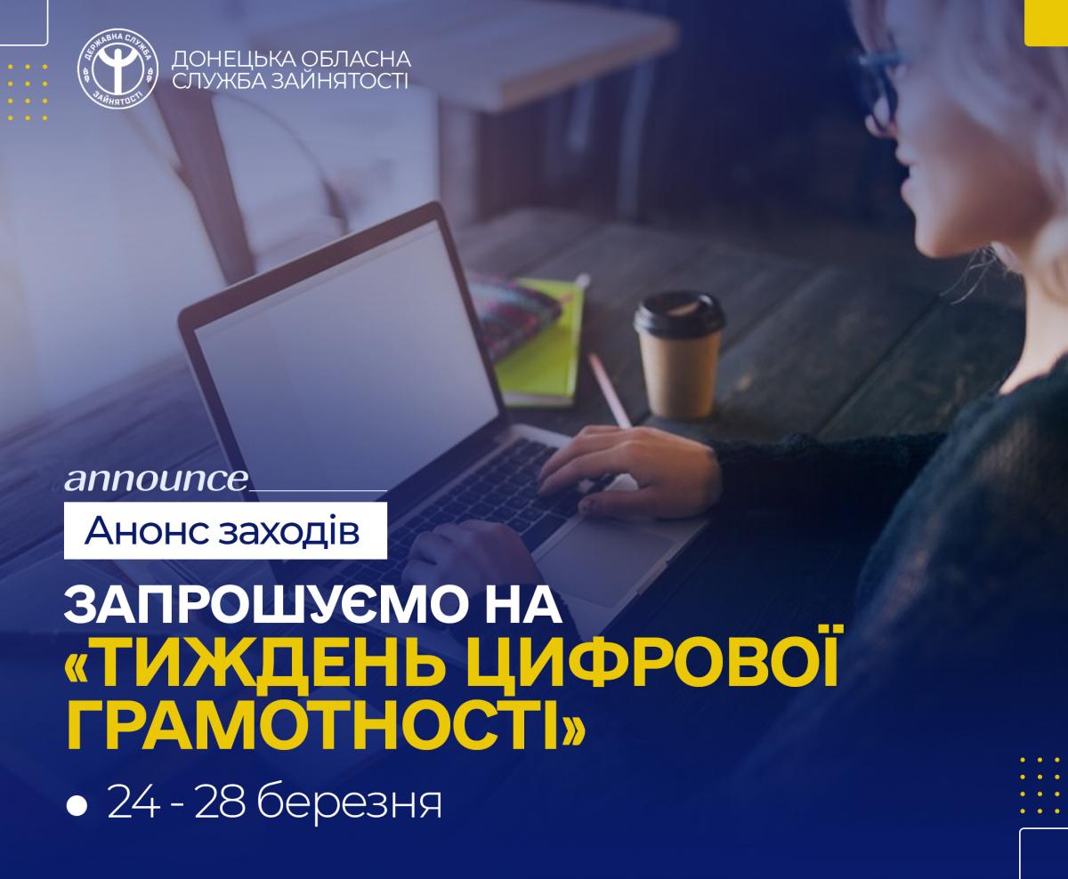Донецька обласна служба зайнятості в рамках профорієнтаційного проєкту «Шлях до успіху: розвиток, підтримка, можливості» організовує «Тиждень цифрової грамотності» – серію безкоштовних вебінарів і тренінгів, спрямованих на підвищення цифрових навичок.
