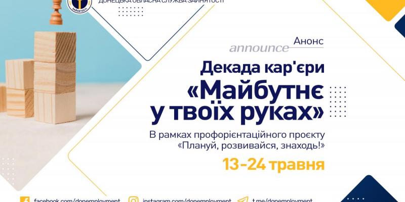 З 13 по 24 травня Донецька обласна служба зайнятості запрошує учнів 9-11 класів до участі у третьому етапі профорієнтаційного проєкту "Плануй! Розвивайся! Знаходь!" - Декаді кар'єри "Майбутнє у твоїх руках".