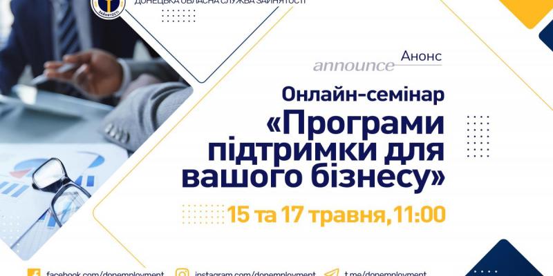 15 та 17 травня об 11:00 Донецький обласний центр зайнятості запрошує підприємців та громадян на онлайн-семінар "Програми підтримки для вашого бізнесу".