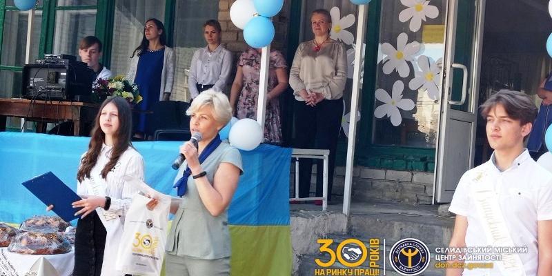 31 травня фахівчиня з профорієнтації Селидівського міського центру зайнятості Анна Карпенко взяла участь в святі «Останнього дзвоника», якій відбувся в загальноосвітній школі I-IIIст.№2 м. Селидове.
