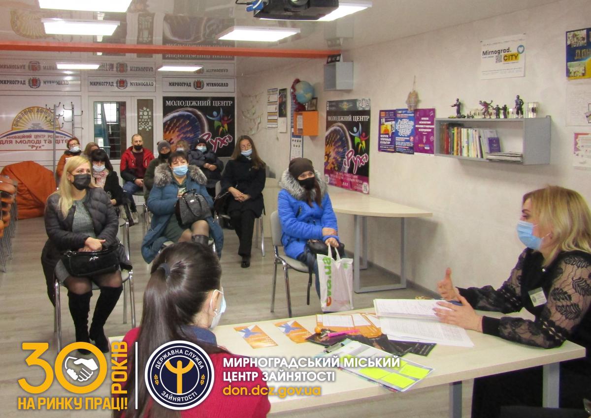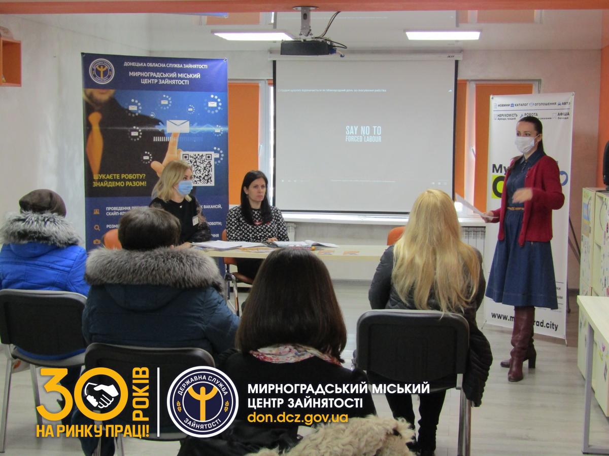 3 грудня в рамках проведення Всеукраїнської акції «16 днів проти насильства» фахівці Мирноградського міського центру зайнятості спільно з представниками Відділу сім’ї, молоді та спорту ММР та Мирноградського міського центру соціальних служб провели семінар для клієнтів служби зайнятості.