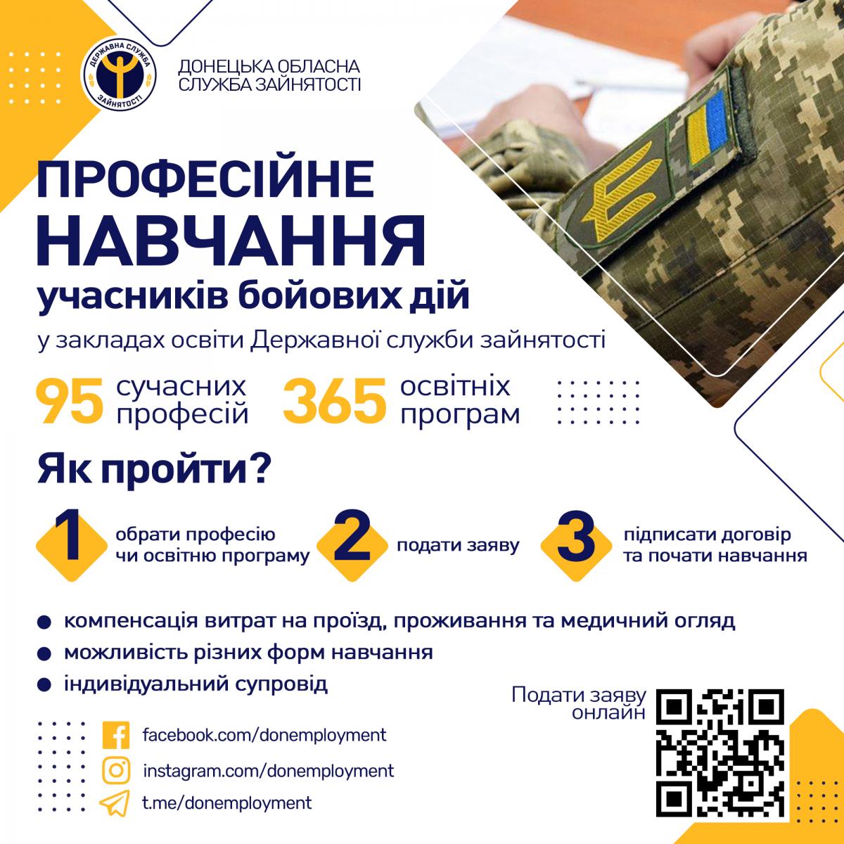 Наразі реалізується урядовий проєкт, який дозволяє цим категоріям громадян пройти первинну професійну підготовку, перепідготовку, а також підвищення кваліфікації безкоштовно в закладах професійної (професійно-технічної) освіти Державної служби зайнятості (далі — ЦПТО ДСЗ).