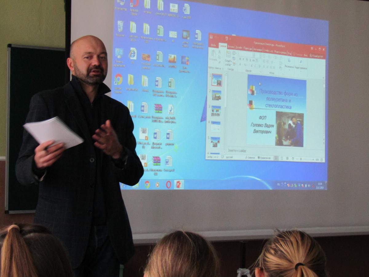 Підприємець Вадим Головко поділився з учнями секретами ведення бізнесу, які він здобув розвиваючи власний. «Підприємець сьогодення – це ініціативна та рішуча людина, яка здатна приймати важливі рішення. Саме тому дуже важливо починати працювати зі школярами, щоб вони мали реальне усвідомлення праці на себе», - наголосив Вадим.