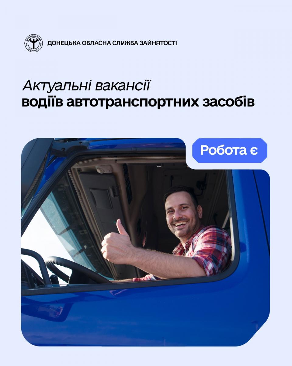 У Донецькій області відкрито вакансії водіїв автотранспортних засобів із рівнем оплати праці до 60 000 грн.