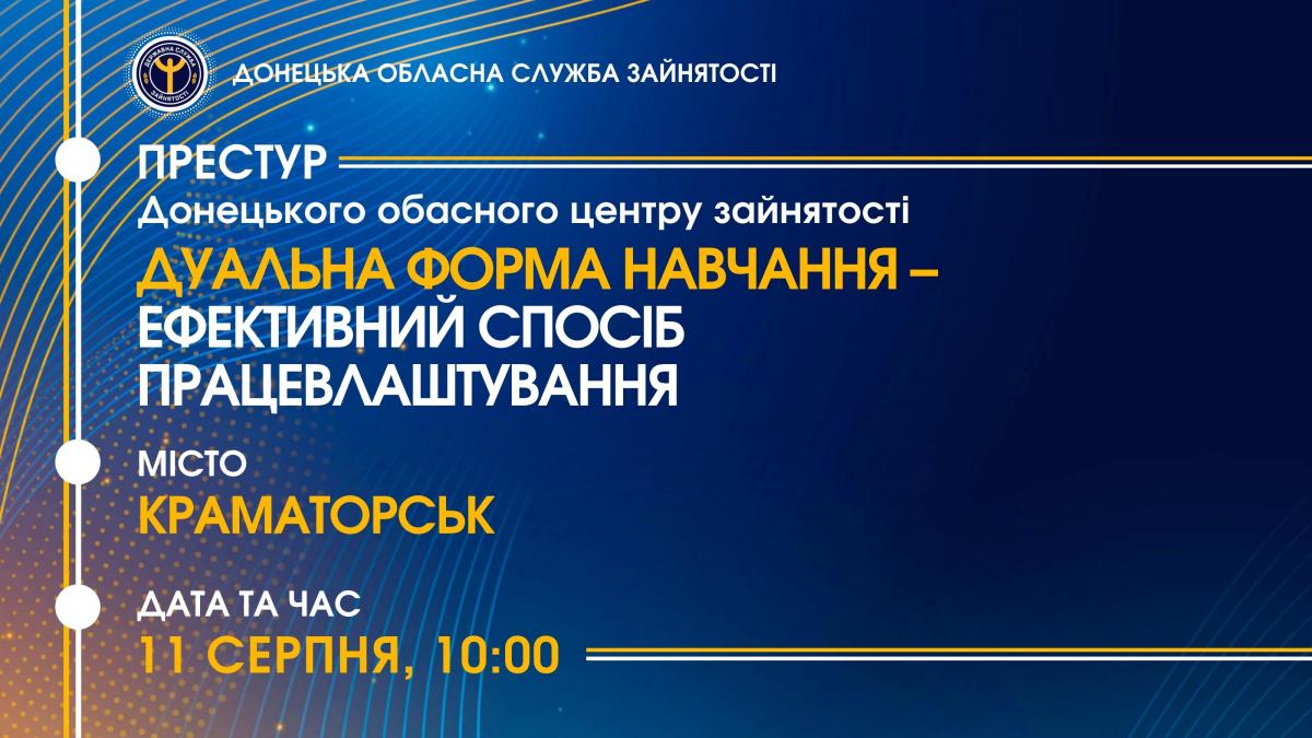 11 серпня Донецька обласна служба зайнятості проведе престур у м.Краматорськ на тему «Дуальна форма навчання – ефективний спосіб працевлаштування».