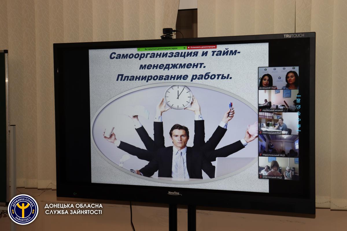 В межах впровадження тренінгової роботи з роботодавцями, тренери Донецького обласного центру зайнятості Ольга Дмітрієва та Ольга Нікітіна ознайомили учасників із найпопулярнішими техніками тайм-менеджменту, основами раціонального планування часу. Окрема увага приділялась визначенню хронотипу людини для оптимального використання робочого часу.