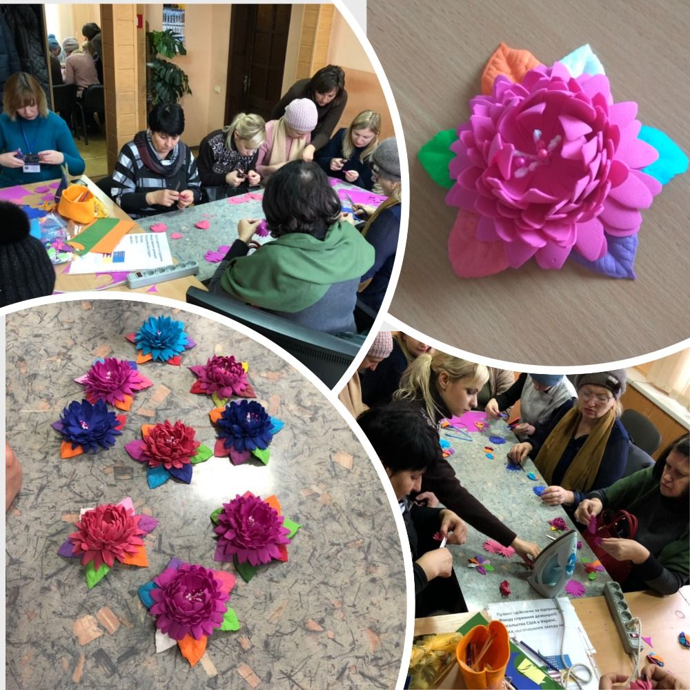 13 грудня у клубі «Шлях до успіху» Лиманського міського центру зайнятості за участю представників БФ «Слов’янське серце» відбувся творчий майстер-клас з виготовлення квітів з фоамірана з циклу заходів з підвищення самооцінки та рівня внутрішньої мотивації по досягненню життєвих цілей.