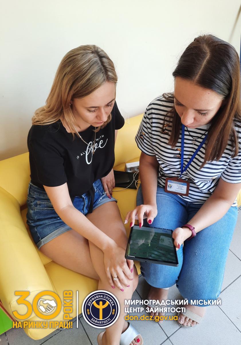 19 серпня рекрутерка Мирноградського міського центру зайнятості Юлія Кличова працювала у складі виїзного мобільного соціального офісу, надавала консультації щодо послуг та можливостей служби зайнятості жителям та роботодавцям мікрорайону «Західний».