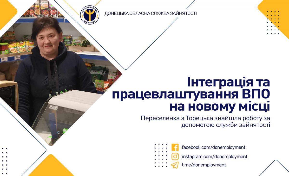 Так, у пошуках роботи до Торецького міського центру зайнятості звернулася переселенка Любов Дригола. Жінка мала досвід роботи в торгівлі понад 20 років. Безробітній запропонували підвищити кваліфікацію на курсах цільового призначення в центрі професійно-технічної освіти державної служби зайнятості. Після закінчення курсів фахівці допомогли скласти резюме та організували співбесіду з роботодавцем - ФОП Катериною Пономаренко.