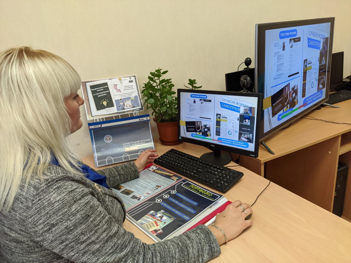 13 жовтня в центрі дистанційних комунікацій Бахмутського міського центру зайнятості відбувся вебінар для безробітних. Шукачі роботи опановували сучасну форму самопрезентації – портфоліо кар’єрного просування з відеорезюме.