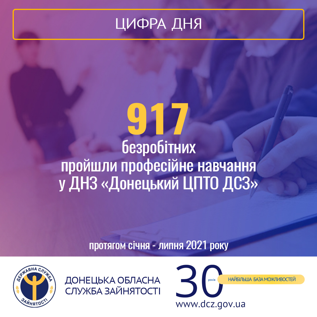 Протягом січня-липня поточного року за направленням Донецької обласної служби зайнятості у ДНЗ «Донецький ЦПТО ДСЗ» професійне навчання, перенавчання та підвищення кваліфікації проходили 917 осіб.