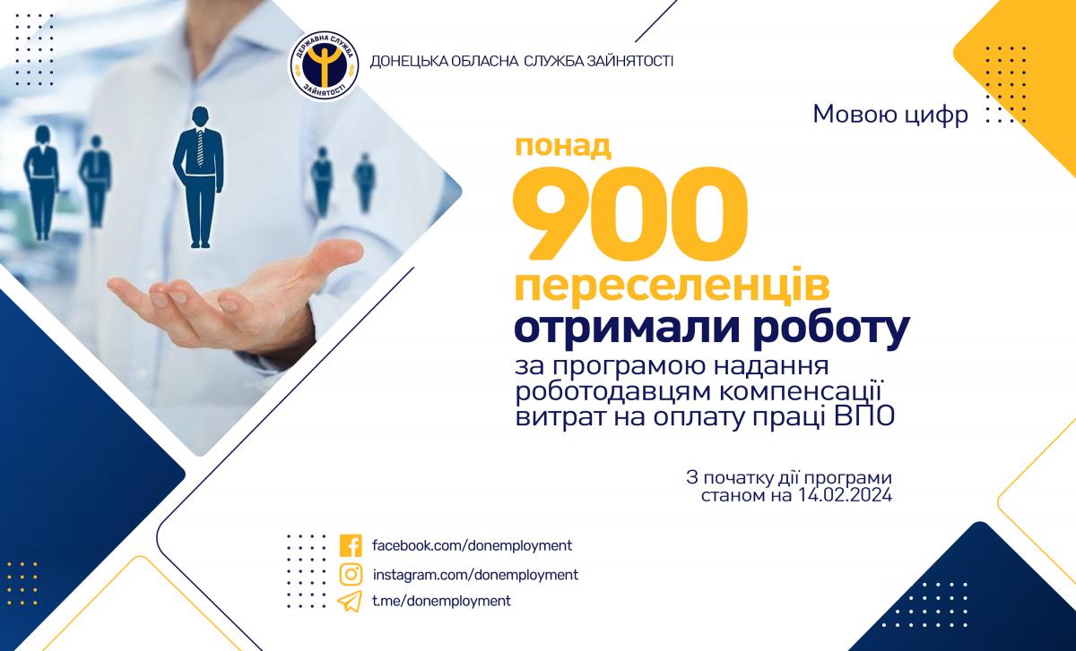 Понад 900 переселенців отримали роботу за програмою надання роботодавцям компенсації витрат на оплату праці ВПО під час дії воєнного стану в Донецькій області.
