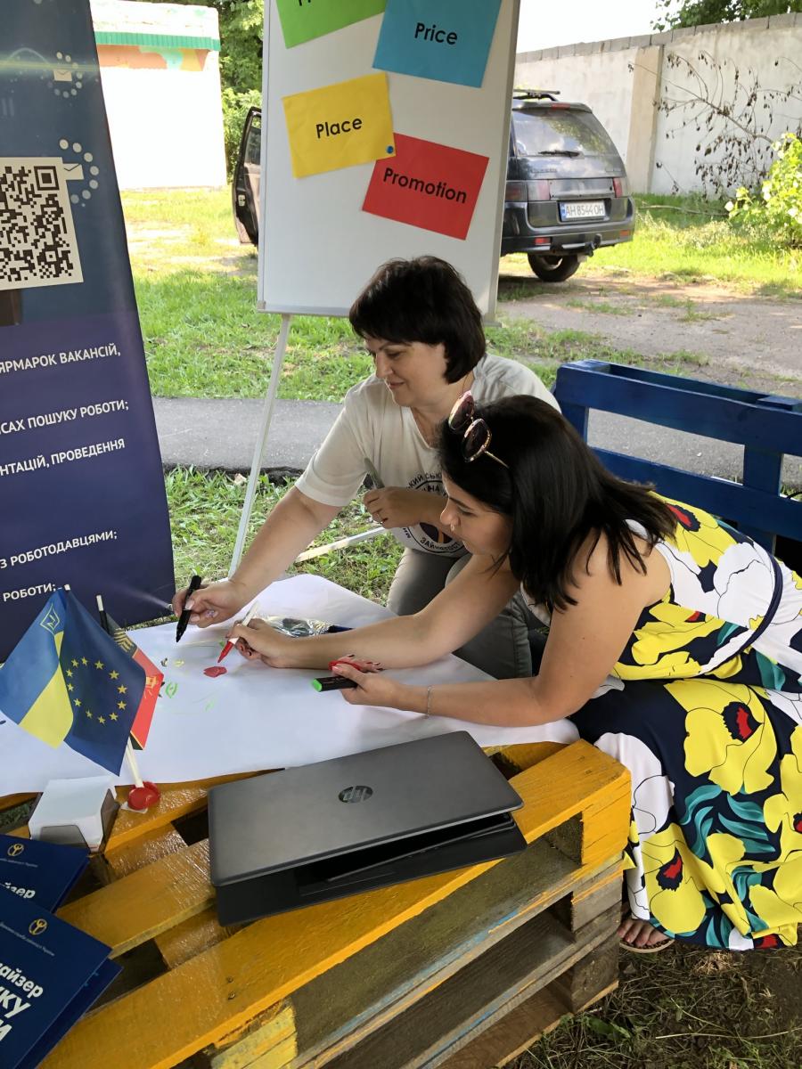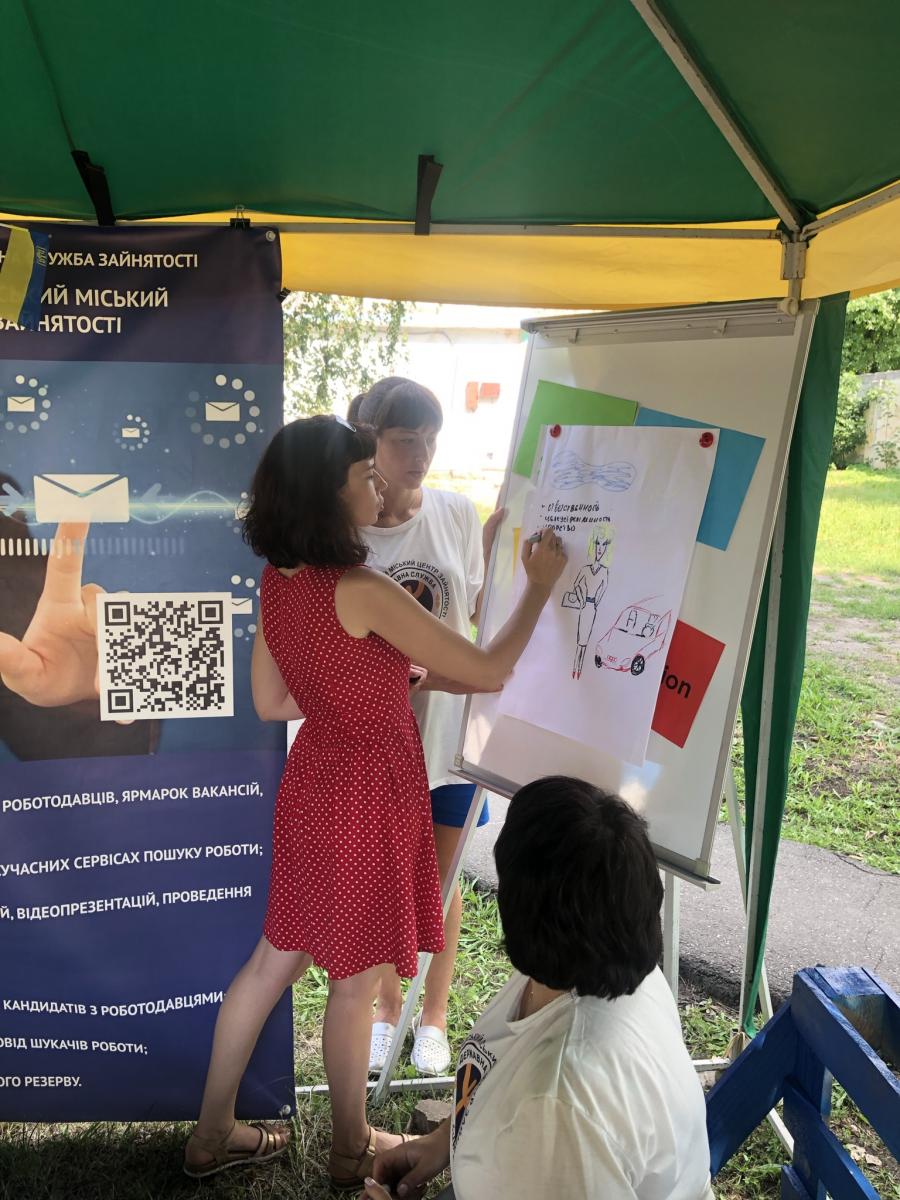 На профорієнтаційній локації фахівці надавали різноманітні послуги служби зайнятості. Дорослі були поінформовані про актуальні вакансії на ринку праці та про переваги офіційно оформлених трудових відносин і ризиків незадекларованої праці для працівників та роботодавців. Також учасники дізнались про інструменти для пошуку роботи, які допомагають презентувати досвід та знання шукача роботи: портфоліо безробітного та відеорезюме.