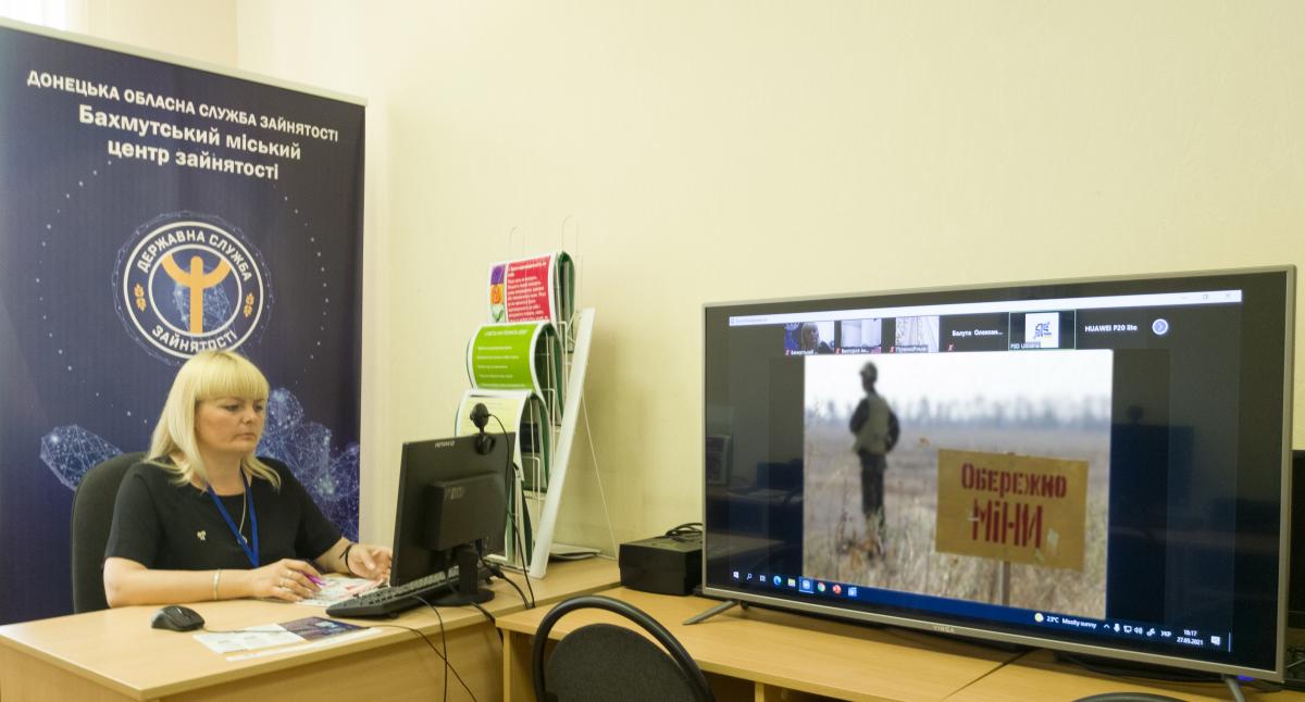 27 травня в центрі дистанційних комунікацій Бахмутського міського центру зайнятості відбувся інформаційний вебінар для безробітних з категорії внутрішньо переміщених осіб. У заході взяла участь представниця міжнародної громадської організації FSD Ukraine Швейцарського фонду з протимінної діяльності пані Ірина.