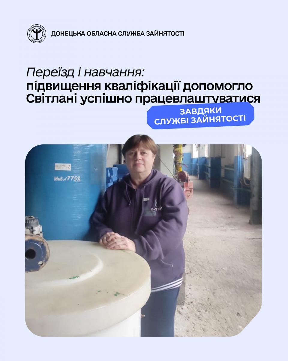 Завдяки професійному досвіду, відповідальності та підтримці служби зайнятості пані Світлана успішно працевлаштувалася за фахом на одному з підприємств Дніпра.
