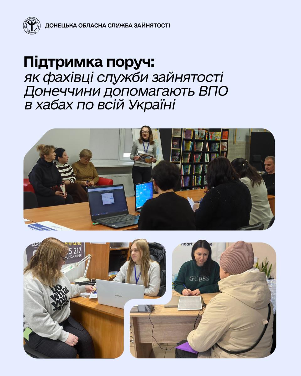 Фахівці служби зайнятості Донеччини, які працюють у хабах, забезпечують повний спектр послуг для ВПО. Це індивідуальні консультації щодо пошуку роботи, підбір актуальних вакансій у регіоні перебування або з можливістю дистанційної зайнятості. Окрему увагу приділяють можливостям професійного навчання, перенавчання та підвищення кваліфікації, зокрема за ваучерами, що дозволяє людям адаптуватися до потреб місцевого ринку праці.