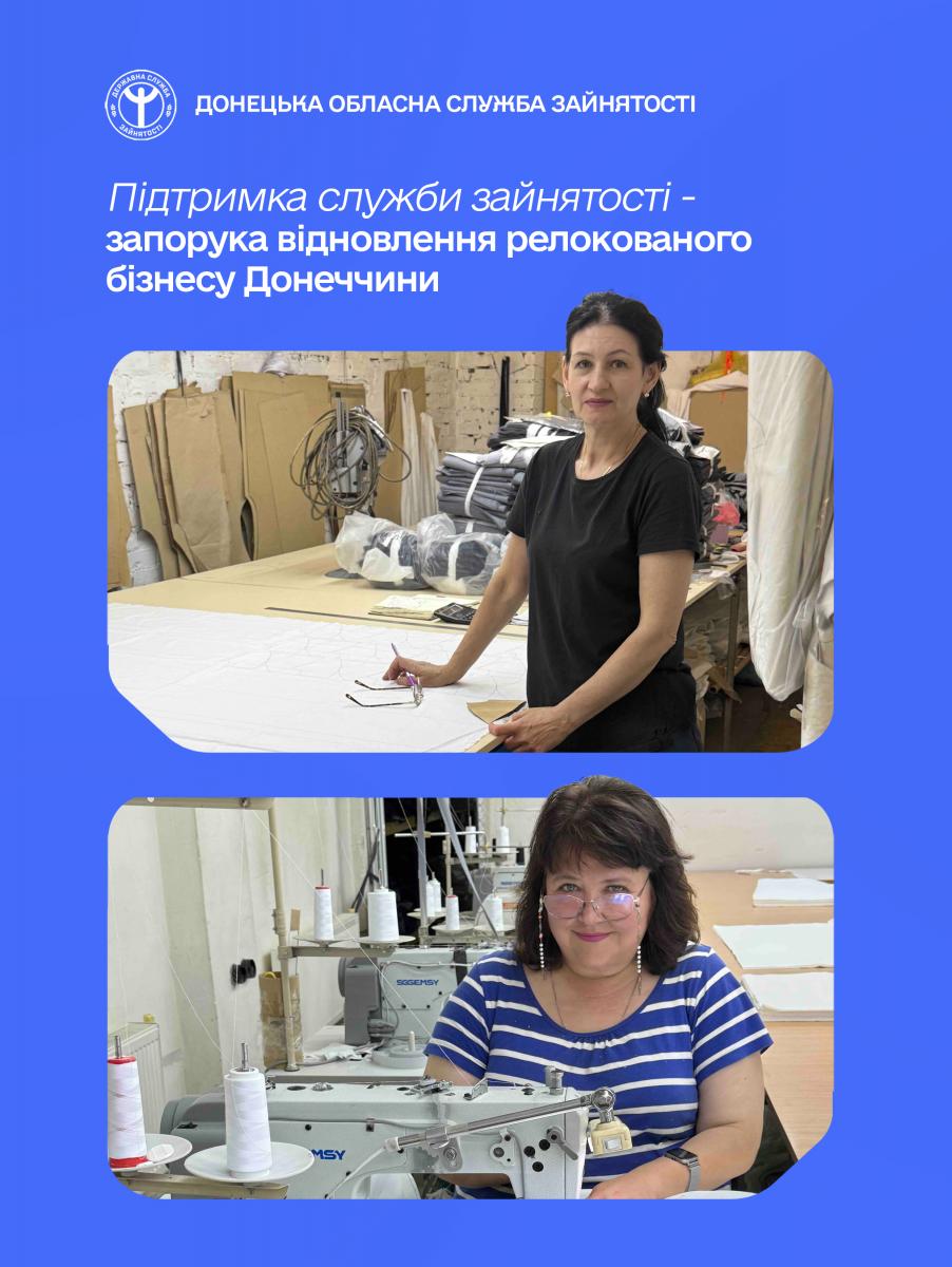 У 2024 році пані Олені вдалося знайти нову локацію, і вона знову звернулася по допомогу до фахівців служби зайнятості Донеччини. Спільними зусиллями вдалося підібрати персонал — нині в ательє працюють четверо внутрішньо переміщених осіб, серед яких швачки Тетяна та Любов.