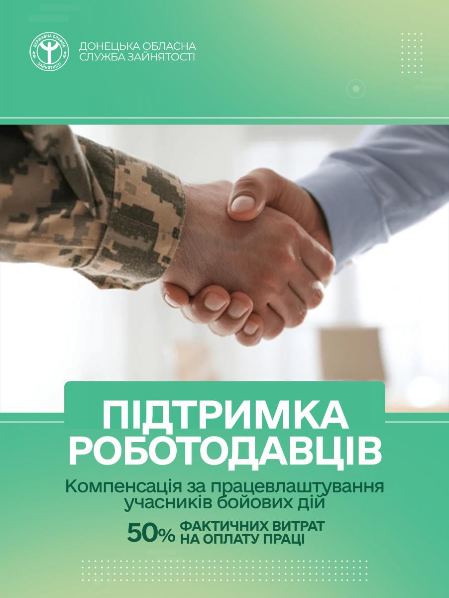 Роботодавці за працевлаштування учасників бойових дій з числа зареєстрованих безробітних, які перебувають на обліку в центрі зайнятості понад 1 місяць, можуть отримати компенсацію 50% фактичних витрат на оплату їх праці.