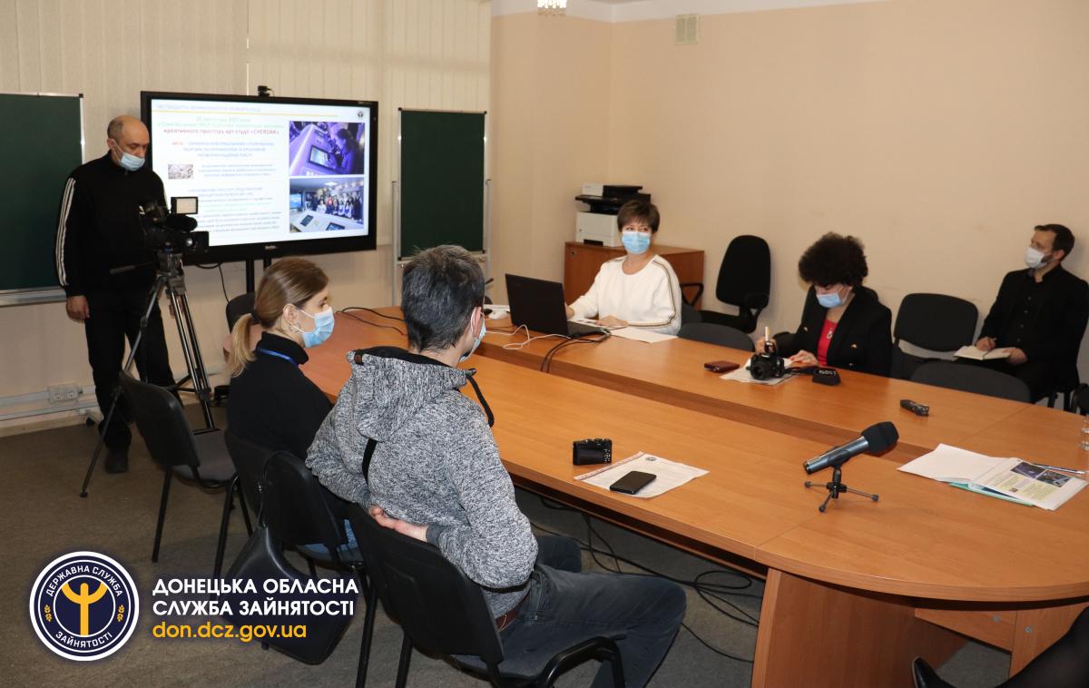 Керівник служби зайнятості Донеччини поінформувала про нестандартні форми роботи і в профорієнтації. Зокрема, мова йшла про створення нового «космічного» простору арт-студії «CHERDAK», яка понад 2 роки поспіль успішно функціонує на базі Слов’янського МЦЗ. За допомогою технологічних можливостей та візуалізації кімнати відбувається «подорож у часі», під час якої учасники можуть ознайомитися з професіями майбутнього, основними трендами розвитку сучасного і майбутнього ринку праці. А за допомогою проєкту відеоекскурсій «Сучасні цікаві професії» усі бажаючи можуть дізнатися про професії, які актуальні на регіональному ринку праці.