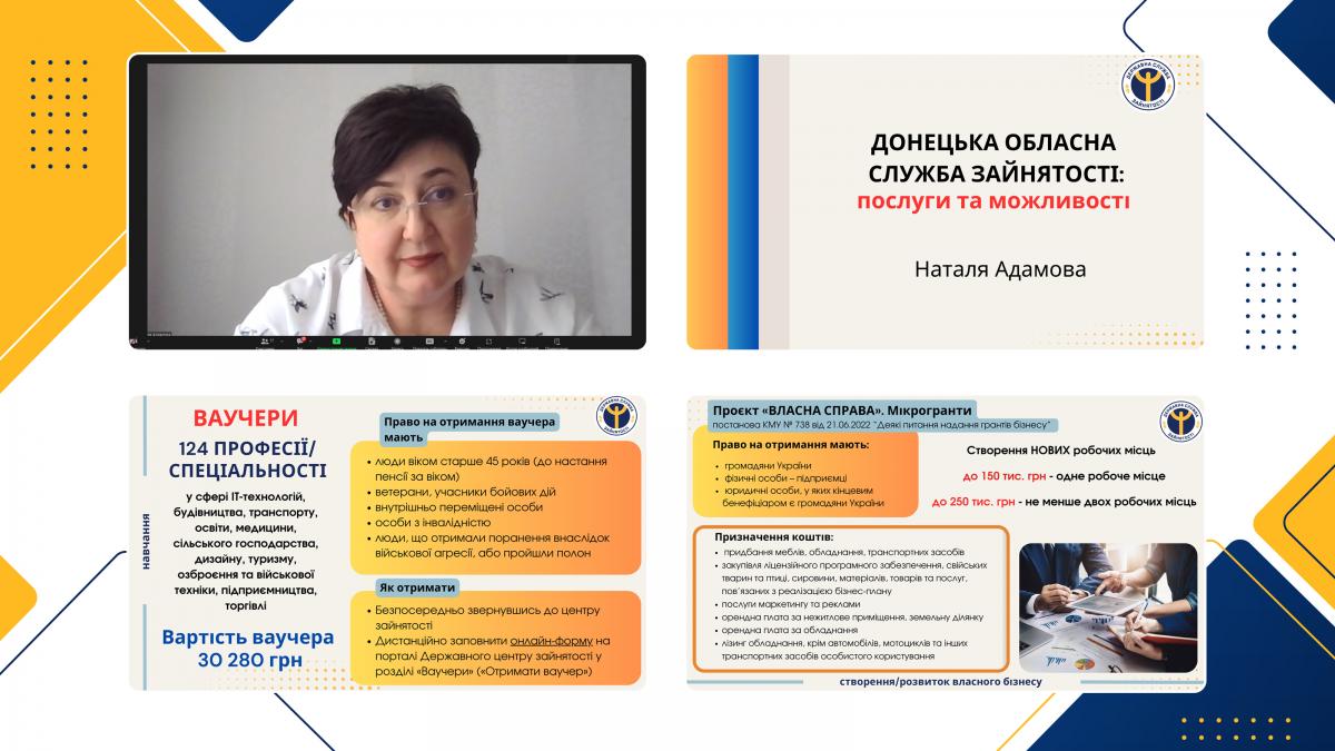 Окремо в.о. директора Донецького ОЦЗ розповіла про можливості для розвитку підприємництва, що надаються державою. Учасники вебінару дізналися про грантові програми «Власна справа» та «Грант для ветеранів та членів їхніх сімей», які дають можливість започаткувати або розширити власний бізнес.