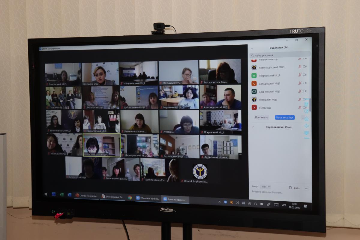 19 травня фахівці відділу організації профорієнтації Донецького обласного центру зайнятості провели відеоконференцію в ZOOM для всіх спеціалістів-профконсультантів Донецької області за темою «Технологія проведення вебінару для безробітних по складанню портфоліо».
