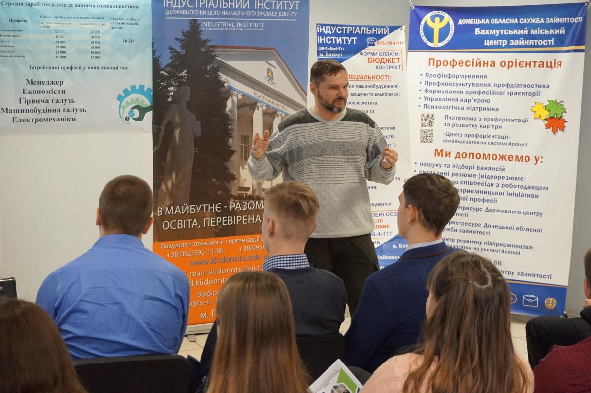 Презентація навчального закладу – одна із форм профорієнтаційної роботи, яка дає можливість старшокласникам визначитися з професією в умовах реального життя, отримати інформацію з першоджерел, поспілкуватися з викладачами та студентами вишу. Саме такий захід відбувся 21 листопада в Бахмутському міському центрі зайнятості. Цього дня випускникам шкіл міста презентували Навчально-науковий індустріальний інститут Донецького національно технічного університету в місті Бахмут.