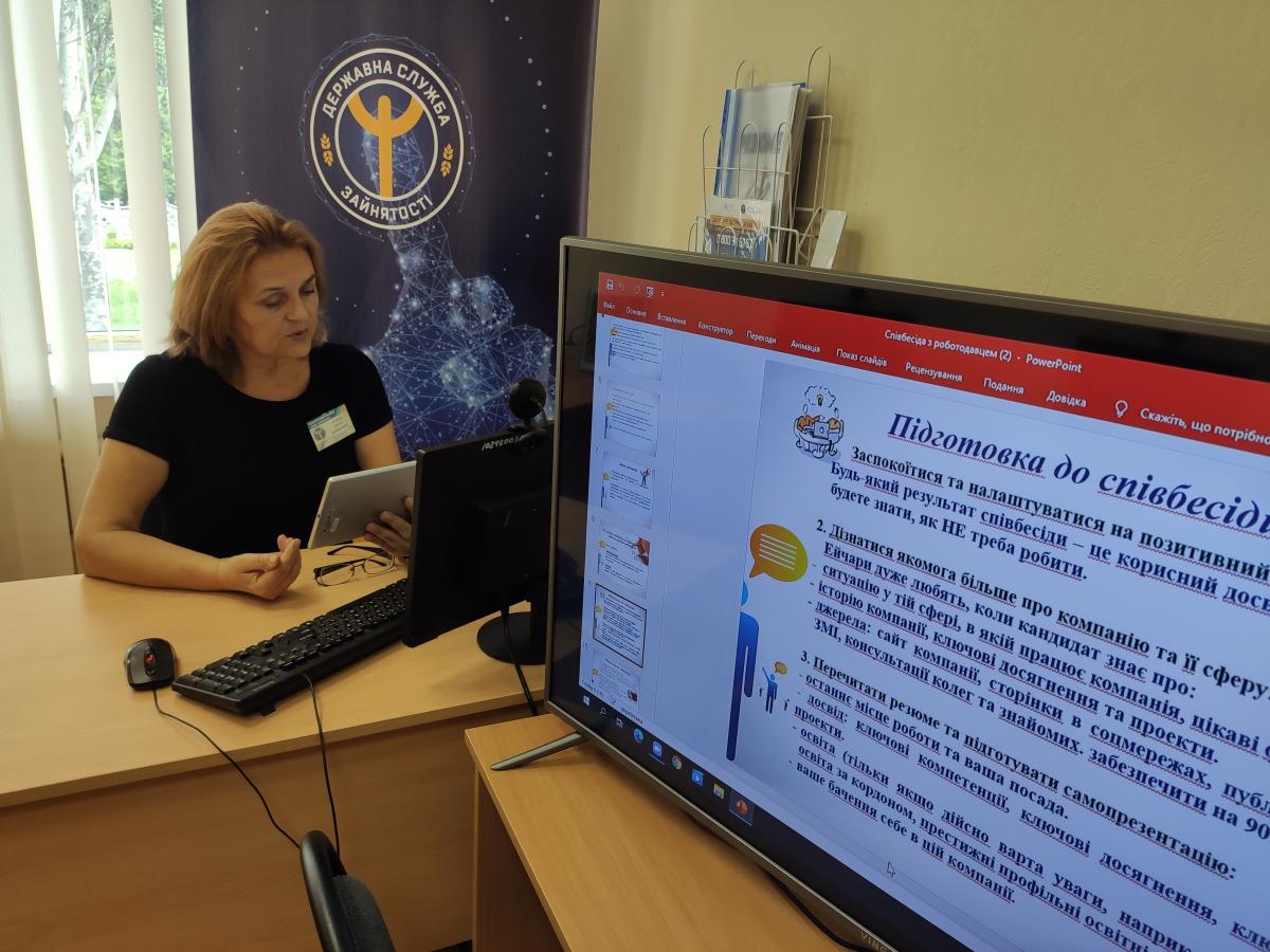 Фахівчиня з профорієнтації Тамара Богдан акцентувала увагу на нових підходах в самопрезентації - це підготовка портфоліо кар’єрного просування з відеорезюме. Потім обговорили типи співбесід з роботодавцем, техніки спілкування з роботодавцем. Окрім цього, фахівчиня запропонувала учасникам за допомогою ділової гри «Презентуй себе» визначити критерії вдалої співбесіди. Обговорили також як скласти позитивне враження на роботодавця під час співбесіди.