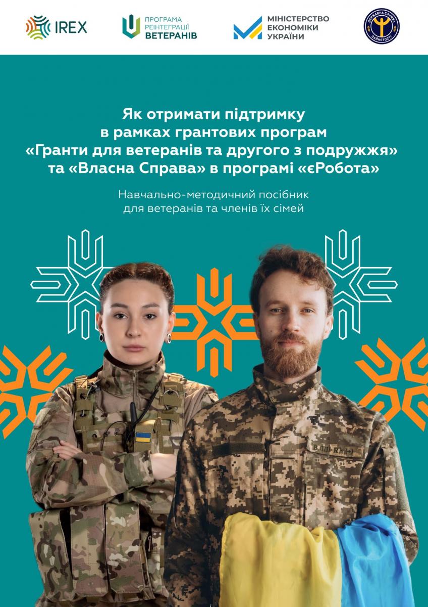 Команда Програми реінтеграції ветеранів IREX із залученими експертами підготувала навчально-методичний посібник «Як отримати підтримку в рамках грантових програм «Гранти для ветеранів та другого з подружжя» та «Власна Справа» в програмі «єРобота».