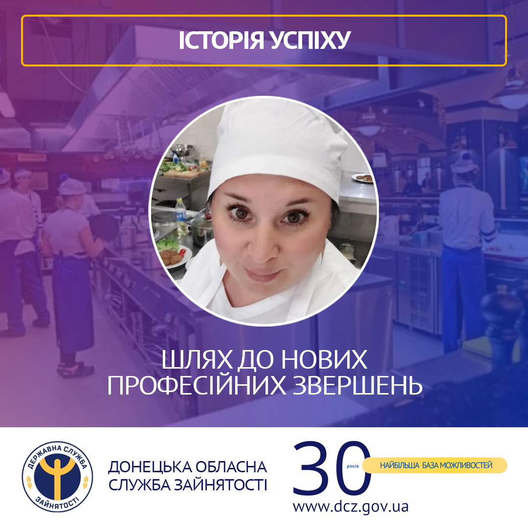 Дівчину на фото в кухарській екіпіровці звуть Ірина Заруба. Вона стала першою у Маріуполі учасницею програми Державної служби зайнятості з підтвердження результатів неформального професійного навчання за кваліфікацією кухаря.