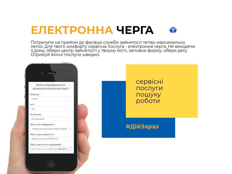Електронна черга – сучасний сервіс, який дозволяє в режимі онлайн записатися на індивідуальний прийом до фахівця будь-якого центру зайнятості у зручний час. Новий сервіс дозволяє зекономити час і заздалегідь обумовлює мету візиту.