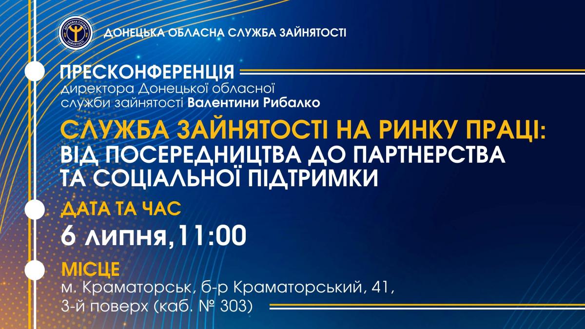 6 липня Донецькою обласною службою зайнятості буде проведено пресконференцію «Служба зайнятості на ринку праці: від посередництва до партнерства та соціальної підтримки» за участю директорки Донецької обласної служби зайнятості Валентини Рибалко.