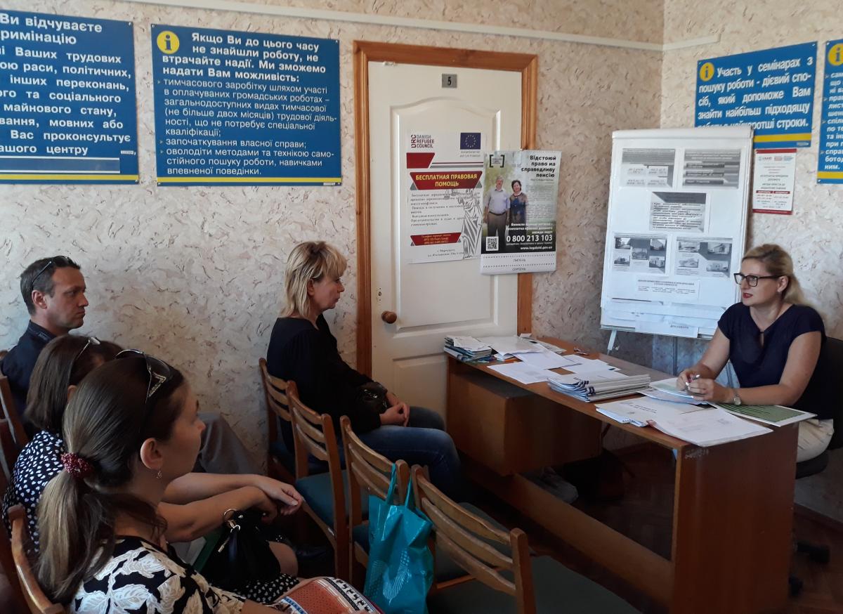 Фахівець центру зайнятості Ганна Пшенична поінформувала шукачів роботи про основні послуги служби зайнятості та переваги офіційного працевлаштування, застерегла від можливого шахрайства при нелегальній зайнятості, зокрема при працевлаштуванні за кордоном.