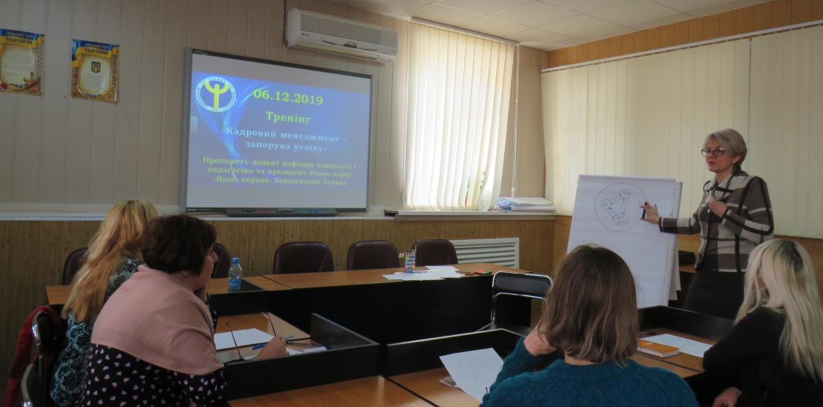 6 грудня у Краматорському центрі зайнятості доцент кафедри психології і педагогіки Горлівського інституту іноземних мов ДВНЗ «Донбаський державний педагогічний університет» та президент бізнес-клубу Тетяна Борзенцева провела тренінг «Кадровий менеджмент». До програми заходу увійшли питання: взаємовідносини в колективі, мотивація працівників, забезпечення дисципліни на підприємстві та досягнення поставлених цілей компанії.