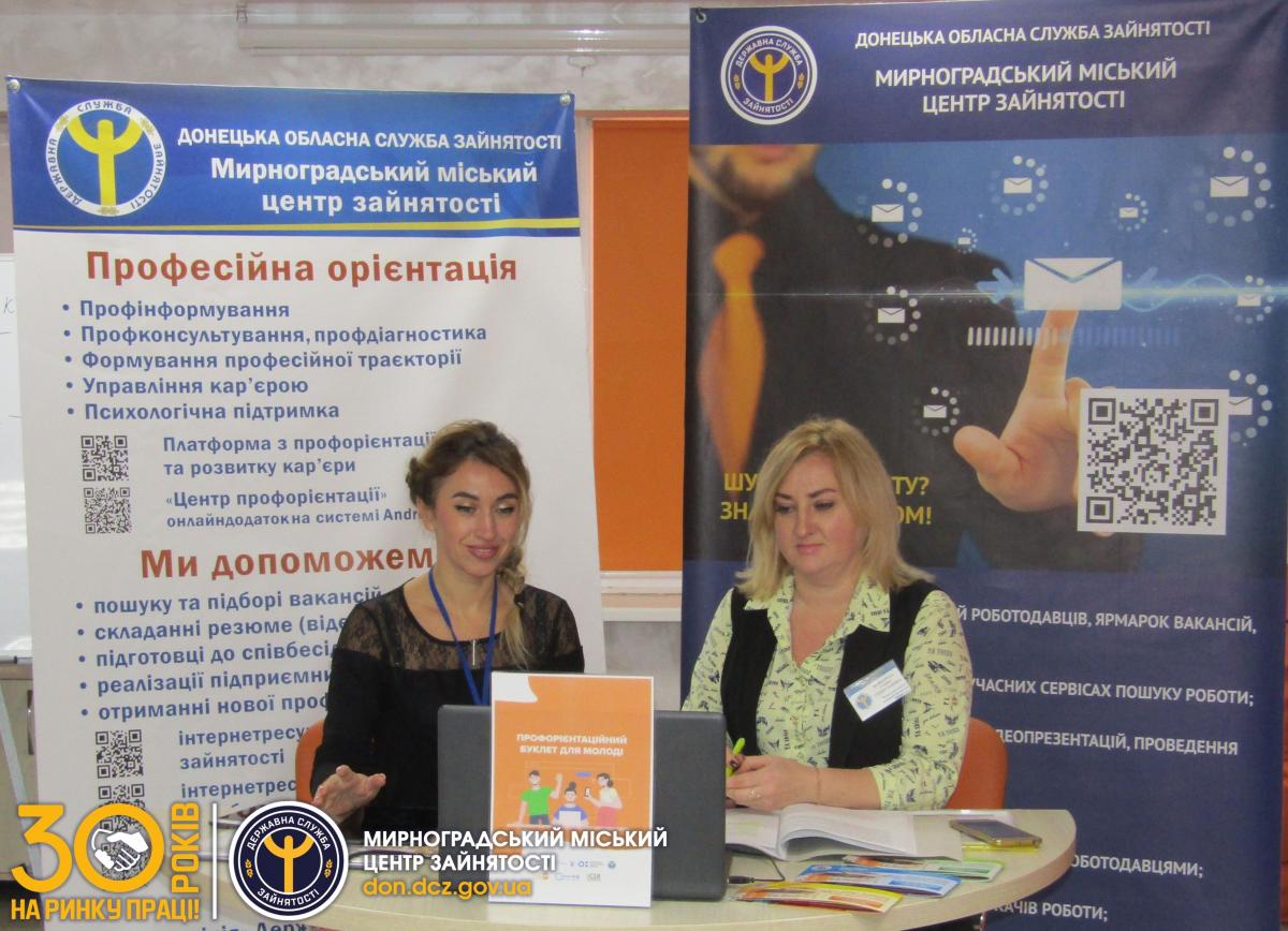 Проблема вибору професії рано чи пізно постає перед будь-яким школярем, саме тому 12 жовтня фахівці Мирноградського міського центру зайнятості організували презентацію навчальних закладів для учнів 9-х класів загальноосвітніх шкіл Мирнограда. Захід відбувся в онлайн режимі на базі Молодіжного центру «Рух».