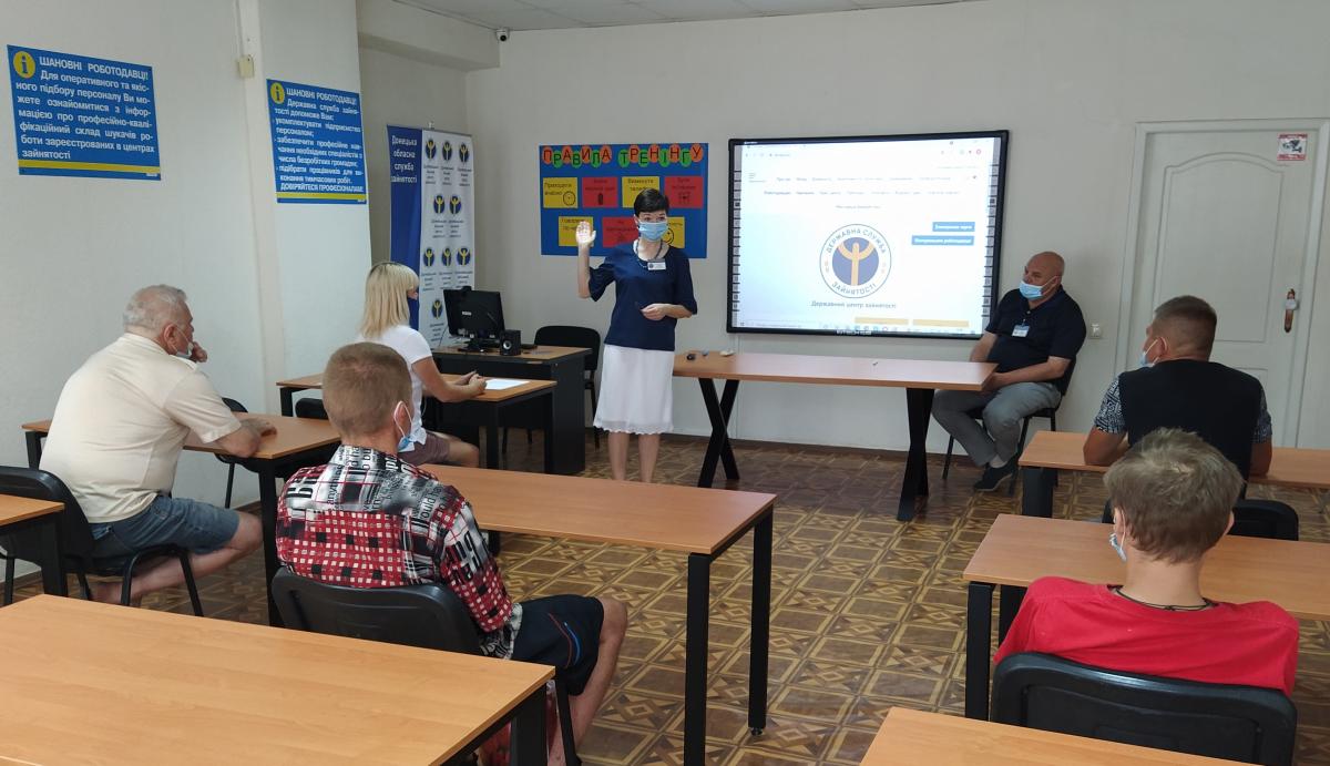 Профконсультантка Олена Бурлуцька презентувала соціальні послуги, які надає державна служба зайнятості. Вона запропонувала учасникам заходу актуальні вакансії та проаналізувала сучасні джерела пошуку роботи.