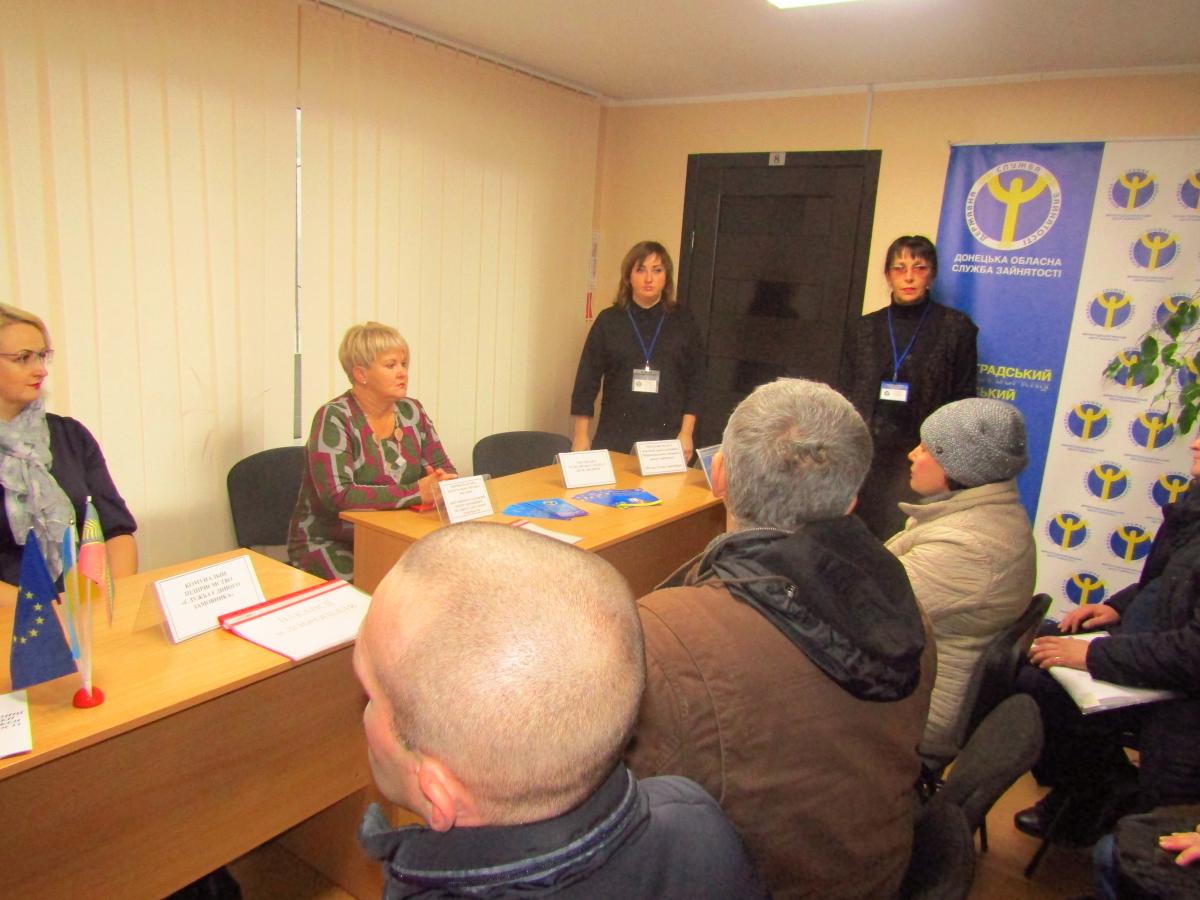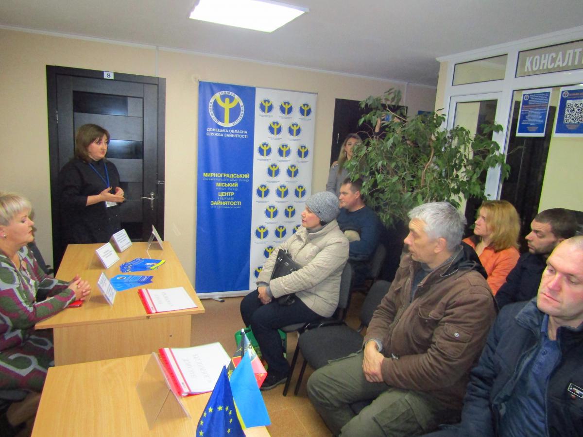 У мініярмарці взяли участь представники КМП "Мирноградський центр первинної медико-санітарної допомоги", КП «Служби єдиного замовника», Мирноградського ВУВКГ КП "Компанія "Вода Донбасу" та Української Гельсінської спілки з прав людини. Роботодавці надали розширену інформацію шукачам роботи про свою потребу в кадрах та детально розповіли про умови праці, обов’язки працівників, рівень заробітної плати, підвищення кваліфікації, пільги, медичне страхування та оздоровлення своїх працівників.
