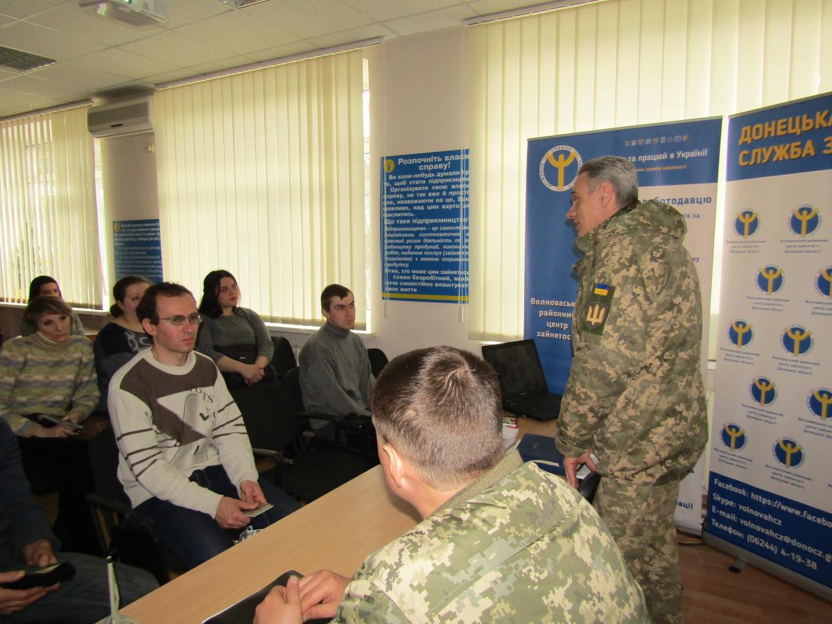 21 березня у Волноваському районному центрі зайнятості відбувся «Семінар з орієнтації на службу в Збройних Силах України» для шукачів роботи.
