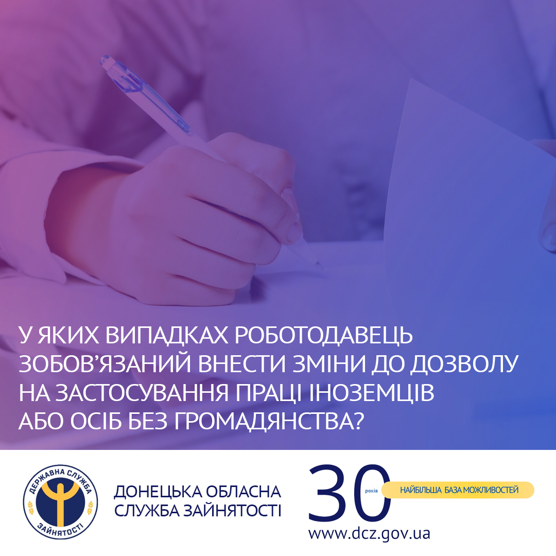 Згідно статті 42-5 Закону України «Про зайнятість населення» роботодавець зобов’язаний звернутись до регіонального центру зайнятості про внесення змін до дозволу у разі виникнення однієї з таких обставин: