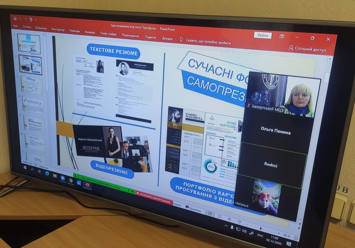 2 грудня в центрі дистанційних комунікацій Бахмутського міського центру зайнятості відбувся вебінар для безробітних. Під час заходу шукачі роботи розглядали питання створення власного портфоліо кар’єрного просування.