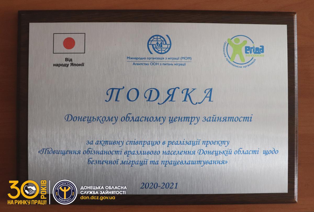 Під час зустрічі представники правозахисної організації «Егіда-Запоріжжя» вручили подяку Донецькому обласному центру зайнятості за активну співпрацю в реалізації проекту «Підвищення обізнаності вразливого населення Донецької області щодо безпечної міграції та працевлаштування».