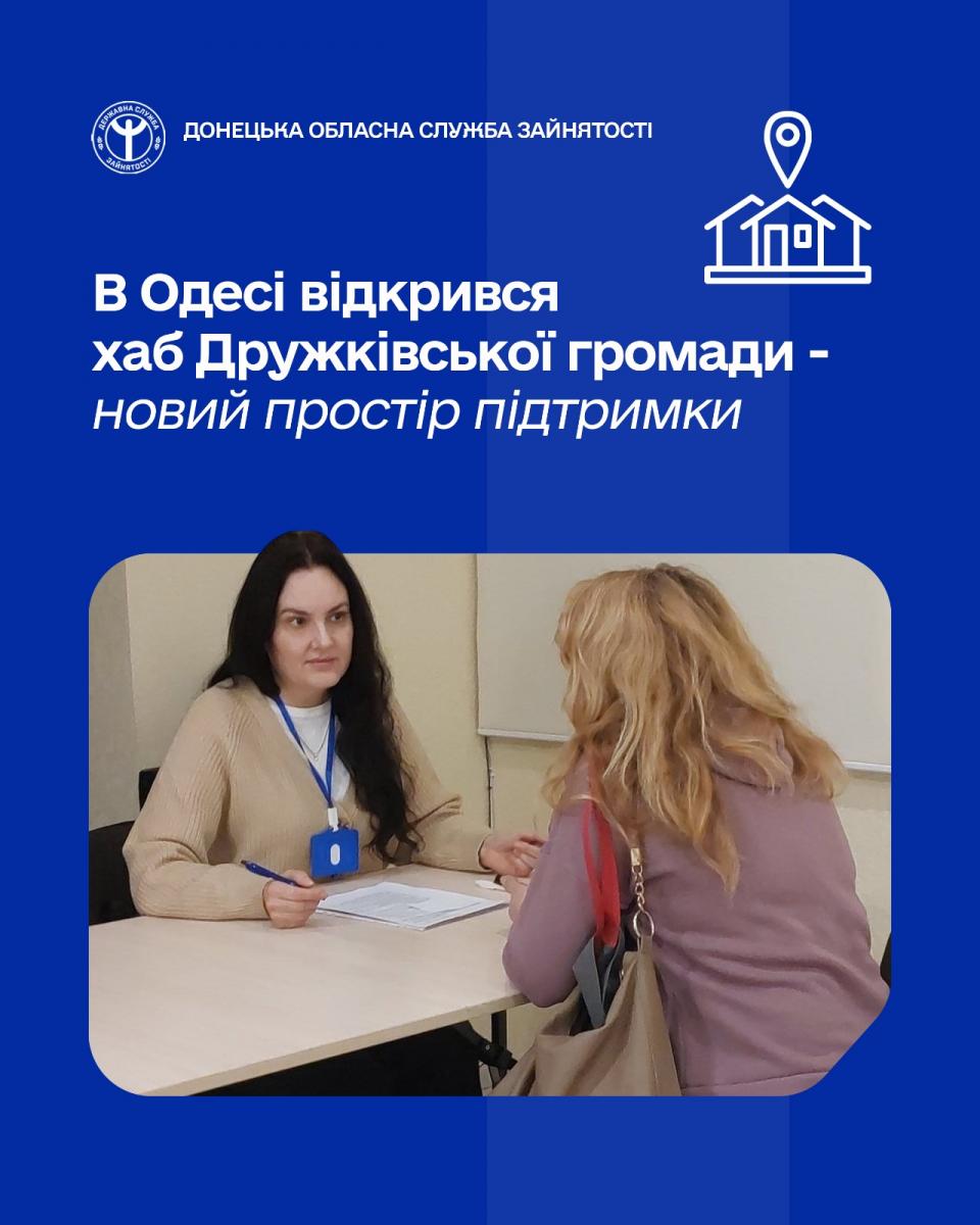 У місті Одеса розпочав роботу хаб Дружківської громади — сучасний простір підтримки для людей, які були вимушені покинути свої домівки та нині проживають на півдні України. Це доступне середовище, де люди можуть отримати консультації, психологічну й інформаційну допомогу, а також практичну підтримку у пошуках роботи та можливостей для професійної реалізації.