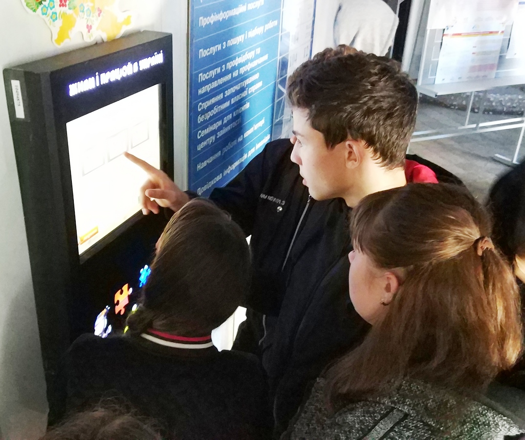 Школярі «приміряли» на себе роль шукачів роботи, побачили як проводиться підбір вакансій, ознайомилися з технікою пошуку роботи за допомогою тачскріна.