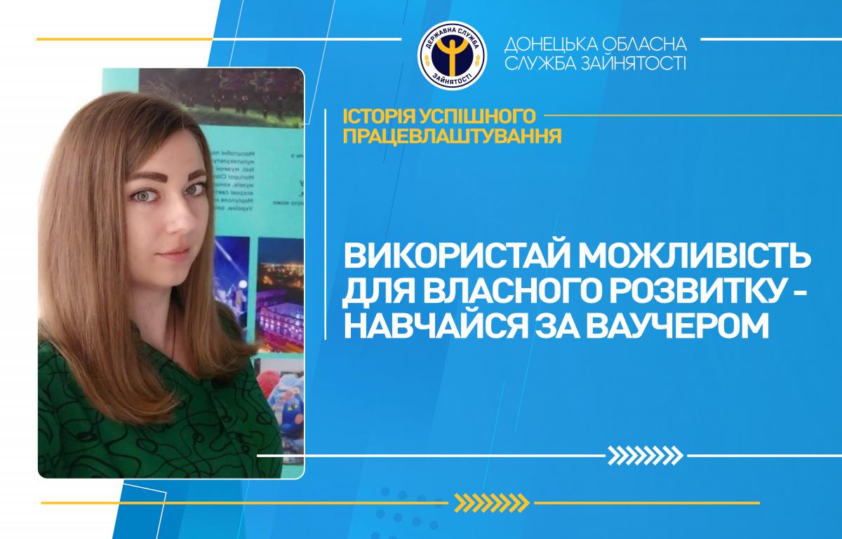 Серед клієнтів служби зайнятості Донеччини, які отримали ваучер - переселенка з міста Маріуполь Юлія Чекарева. З початком бойових дій молода жінка була вимушена покинути рідну домівку та перемістилася до м. Київ. Знайти роботу самотужки на новому місці перебування не вдалося. І Юлія звернулась за допомогою до центру зайнятості, за сприянням якого отримала роботу у релокованому маріупольському підприємстві ККП "М.ЄХАБ".