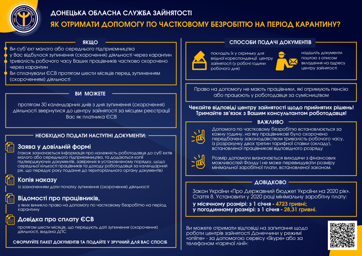 Контактні телефони та Skype-адреси базових центрів зайнятості Донецької області можна переглянути за посиланням https://don.dcz.gov.ua/novyna/donecka-oblasna-sluzhba-zaynyatosti-pereyshla-na-dystanciynu-model-obslugovuvannya-kliyentiv